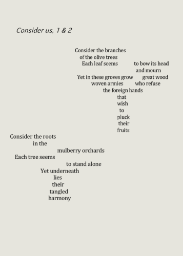 “Consider Us” was written based on the destroyed mulberry orchards of Artsakh and the destroyed olive groves of Palestine. The text is shaped to visually represent the trees while the words themselves speak to each community affected by their removal: Armenians and Palestinians. It shows us how our people not only cultivate the land and its crops in the face of danger but are forever bound within their growth and survive through their existence. Their removal is another act of cultural genocide.