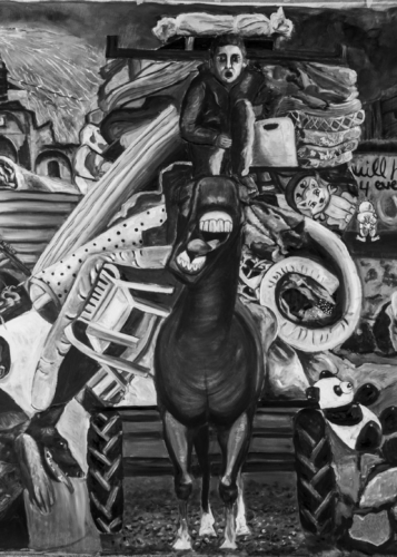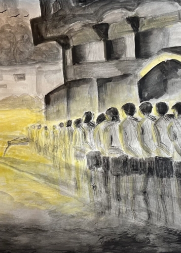 Soon after arriving in the UK, Mattar’s entire world was turned upside down, causing her work to undergo a dramatic shift in style, subject matter and palette. While artist-in-residence at An Effort in Central London (December 2023–February 2024), she documented the genocide in her homeland through a series of mostly monochrome drawings and paintings. She later combined these scenes into a monumental greyscale painting called No Words [see next page]. Mattar wrote and illustrated the bestselling children’s book Sitti’s Bird (2021) based on her own life experiences, which is already in its second print run. In defiance of strict travel restrictions, Mattar has lectured in universities across the USA (2020–21) and she has had solo exhibitions in Palestine (2015 onwards); Costa Rica (2015); Great Britain (2017, 2018, 2023, 2024); Sweden (2018); USA (2019, 2021); Germany (2020); Lebanon (2021); Portugal (2022) and Italy (2022). Most recently, Malak had two concurrent exhibitions in London, and her monumental painting No Words was shown for the first time (March 2024). Her artworks have also been collected, published, and exhibited in numerous group shows worldwide.