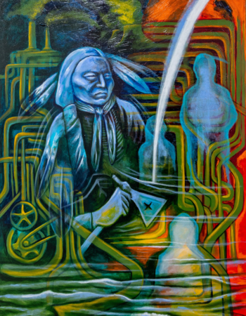 This piece highlights how we are in a time where Native people throughout the world are fighting for land preservation against colonial violence, to exist in relationship with Mother Earth, and to walk in beauty for our future generations against repression and oppression. Our spiritual prayer is for the water that gives us life and for all living creatures. We fight for the right to be human as no treaty has ever been honored. We are in a struggle for human existence in a time of genocide of Indigenous Palestinians. We fight with art as a weapon for true justice.