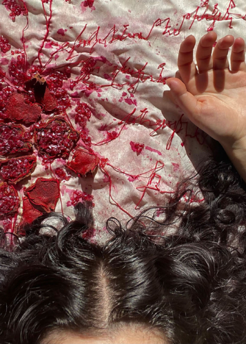 This tapestry lives in reverence to the spirits and survivors of the Armenian Genocide of April 24, 1915. It is a correspondence with my ancestors woven entirely in the Armenian script with thread and pomegranate on cotton. Today as the Armenians in Artsakh have faced blockade, starvation, and genocide once again, I am inclined to think about how art and self-expression can be used as tools for community healing and linguistic survival.
