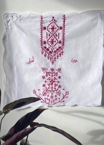 Weaving Home bonds together traditional Palestinian Tatreez embroidery and the ancient practice of Marash stitch from the now occupied lands of Western Armenia after the first genocide of 1915, in commemoration of the second Armenian genocide that took place in Artsakh on September 19th, 2023, as well as the ongoing Palestinian genocide in Gaza. It joins the Arabic and Armenian հույս words for ‘hope’, stitched side by side in a diasporic longing for home.
