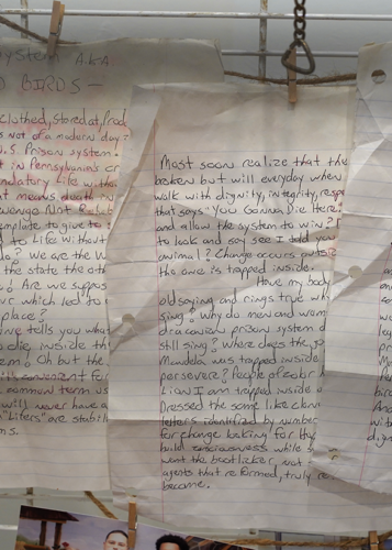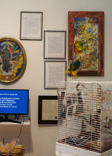 The installation accompanied the Caged Birds video (2023. 05:28 min). The main focal point is the bird cage that is decorated as a prison cell. Hanging in the cage are family photos and the original handwritten copy of Caged Birds. The cage also contains a bible, candle, rosary, the book that Oscar co-authored, a blanket, and feathers. Beneath the cage (not pictured) is a folded prison jumpsuit and shoes.