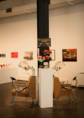 These vintage salon chairs are equipped with headphones and a tablet. The tablets and headphones play a video that contains “subliminal” text and audio deprogramming messages. One chair is indicated that it is for #Whites Only, whereas the other is indicated that it is for #NotWhites Only, with each chair playing different messages based on the intended audience.